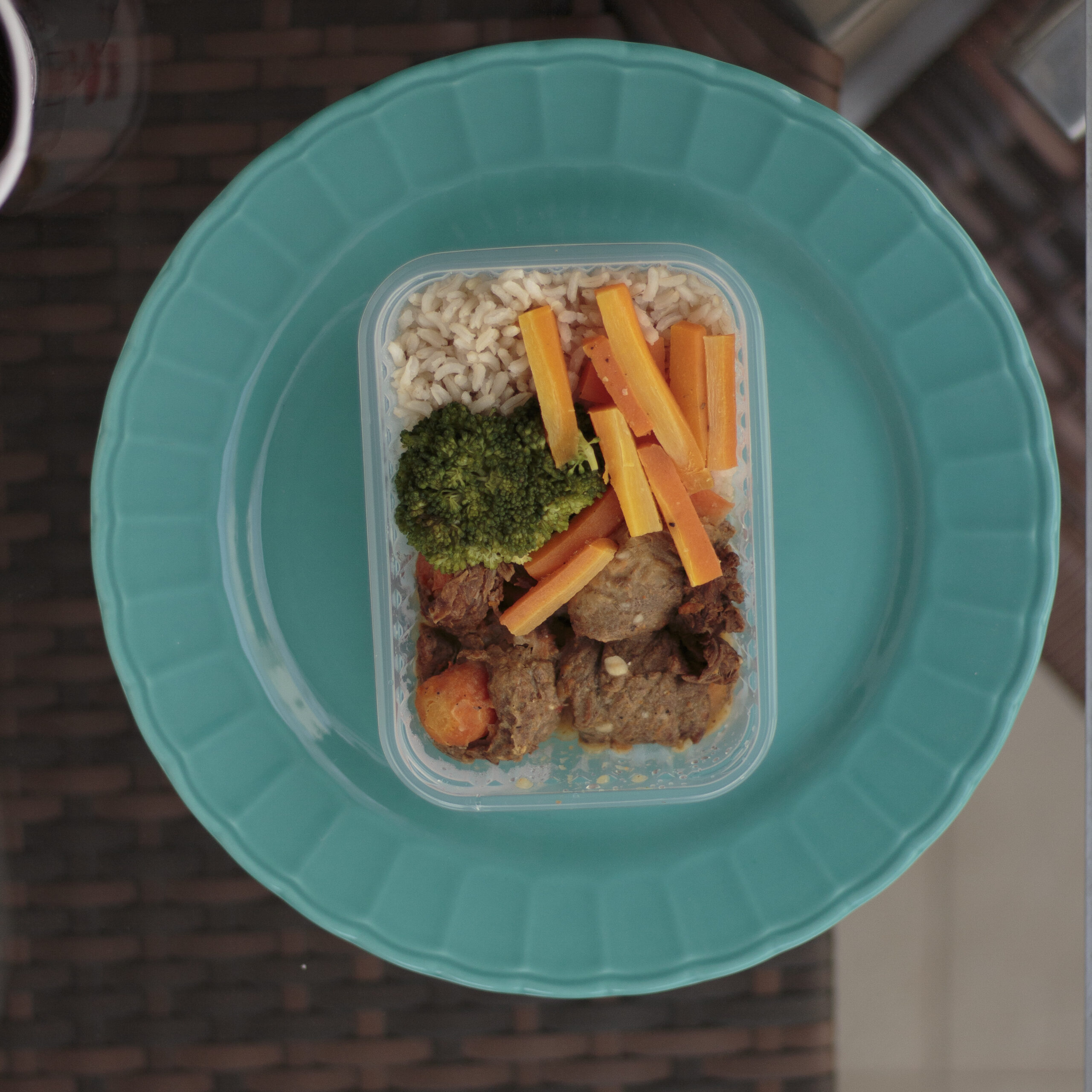 Coxão mole, arroz integral, brócolis, cenoura, molho de tomate, sal marinho, orégano, pimenta do reino, lemon pepper, alho, cebola, azeite de oliva.