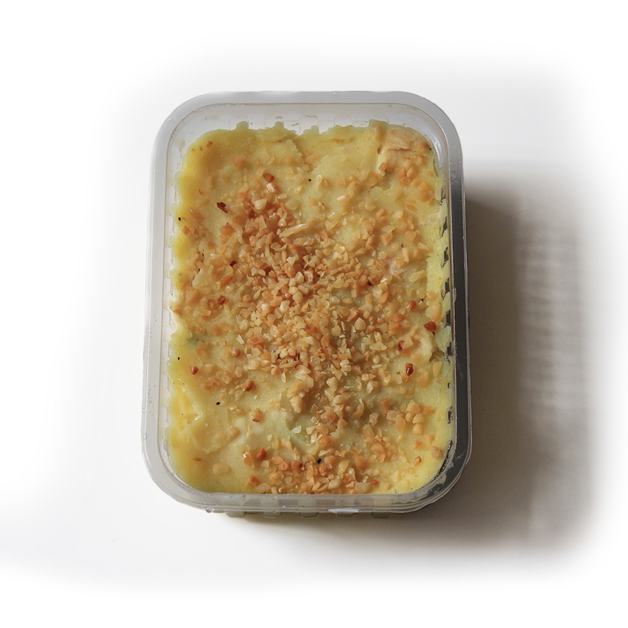 Escondidinho de peito de frango desfiado com purê de batata doce e amendoim