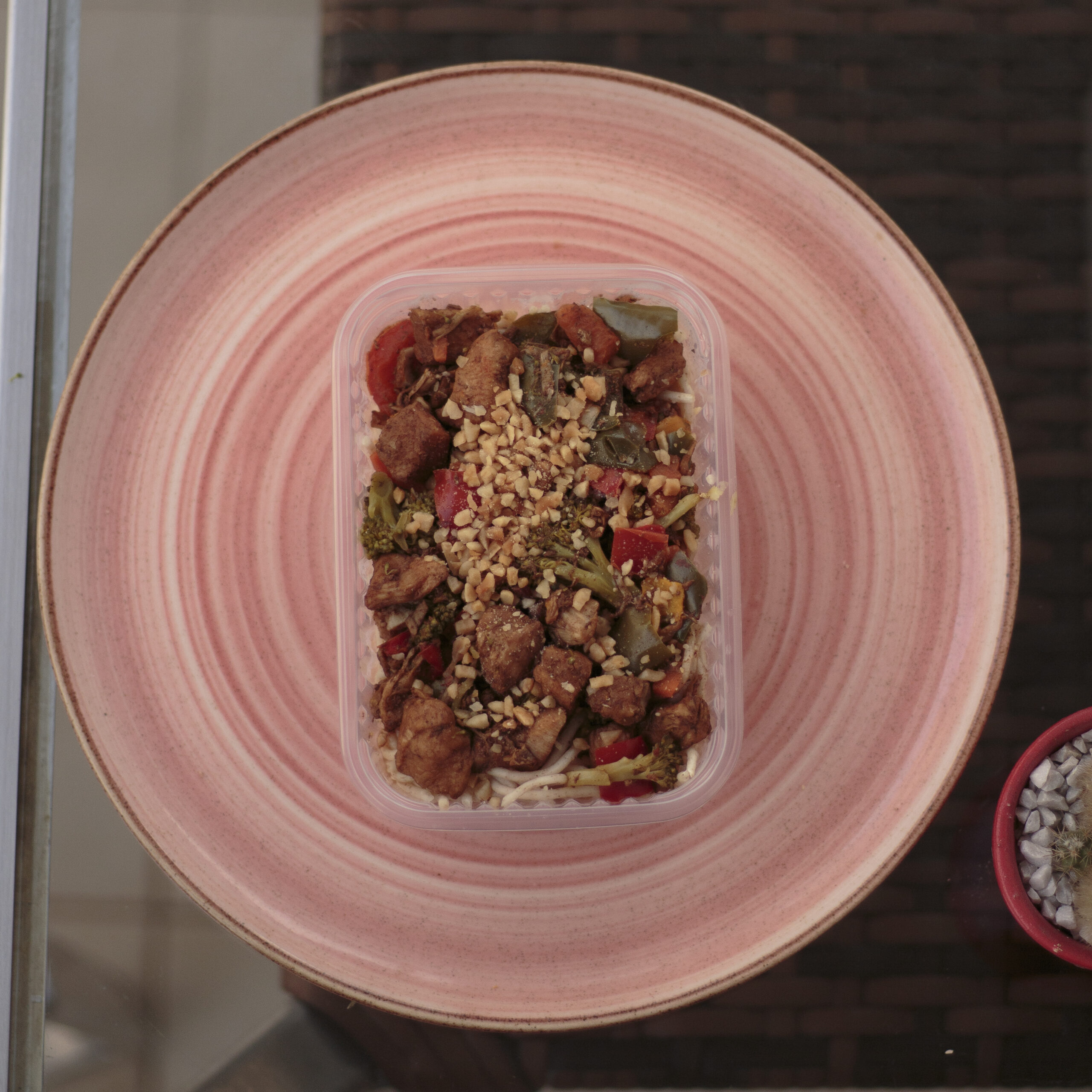 Peito de frango em cubos, macarrão integral, brócolis, cenoura, pimentão, molho de soja light, orégano, pimenta do reino, lemon pepper, alho, cebola, azeite de oliva, amendoim.