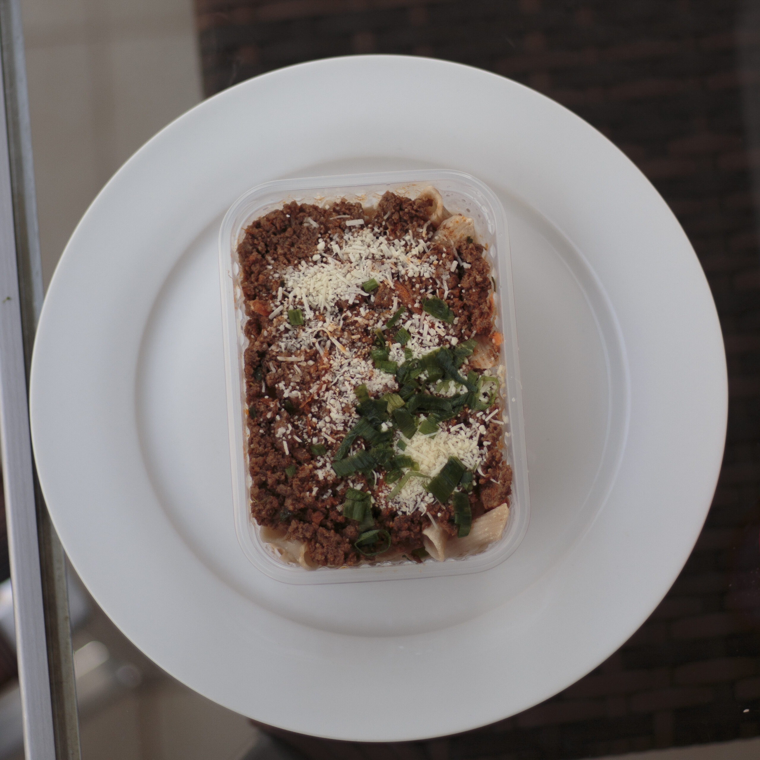 Coxão mole moído, penne integral, cenoura, molho de tomate, cebolinha, salsinha, sal marinho, salsão, alho, cebola, azeite de oliva.